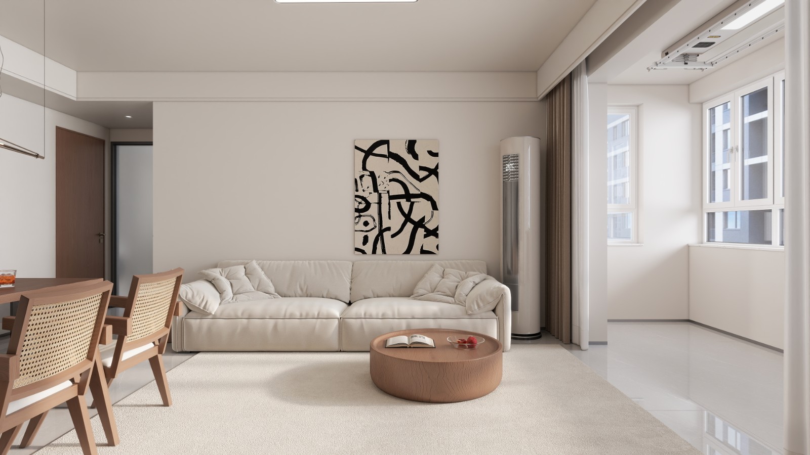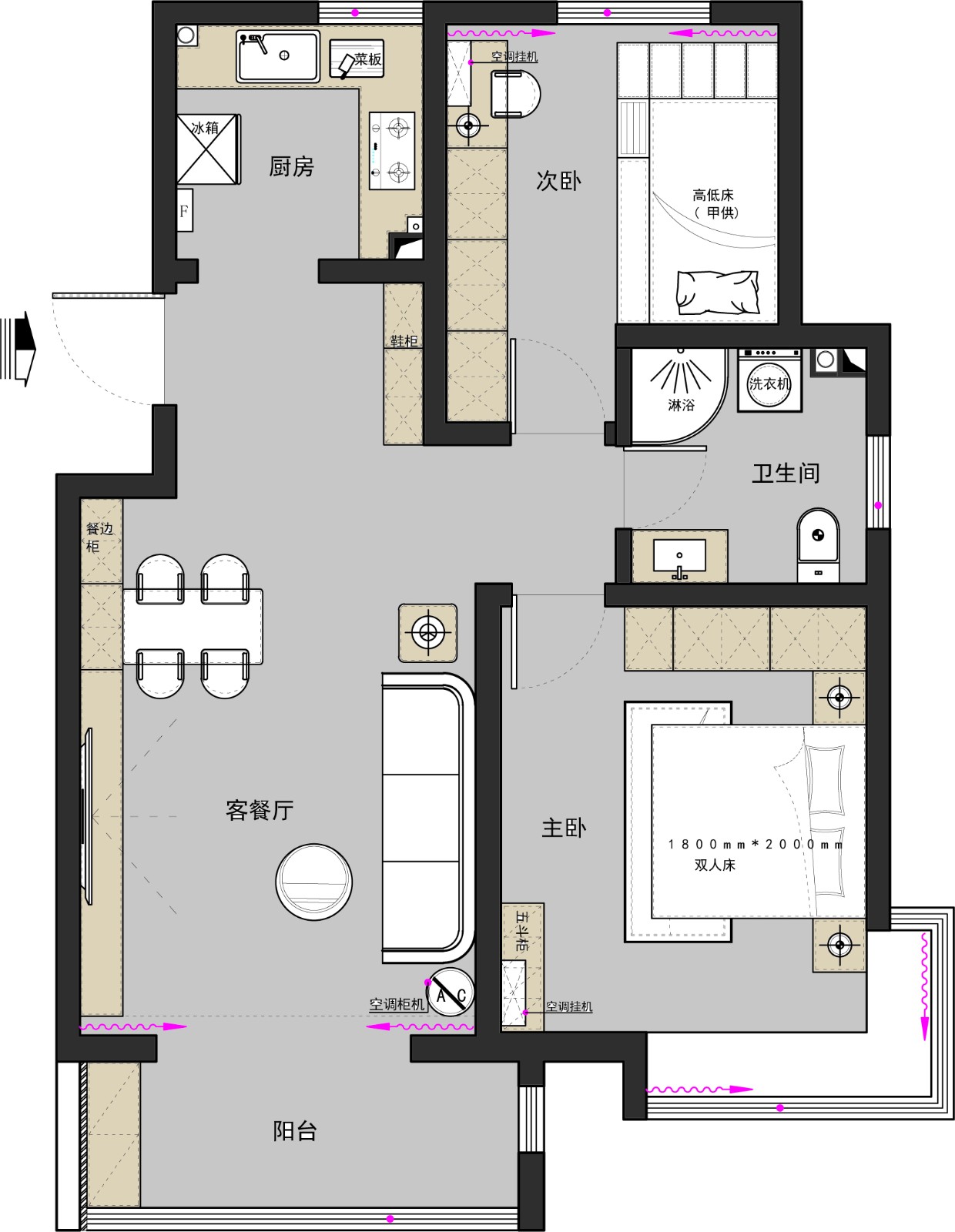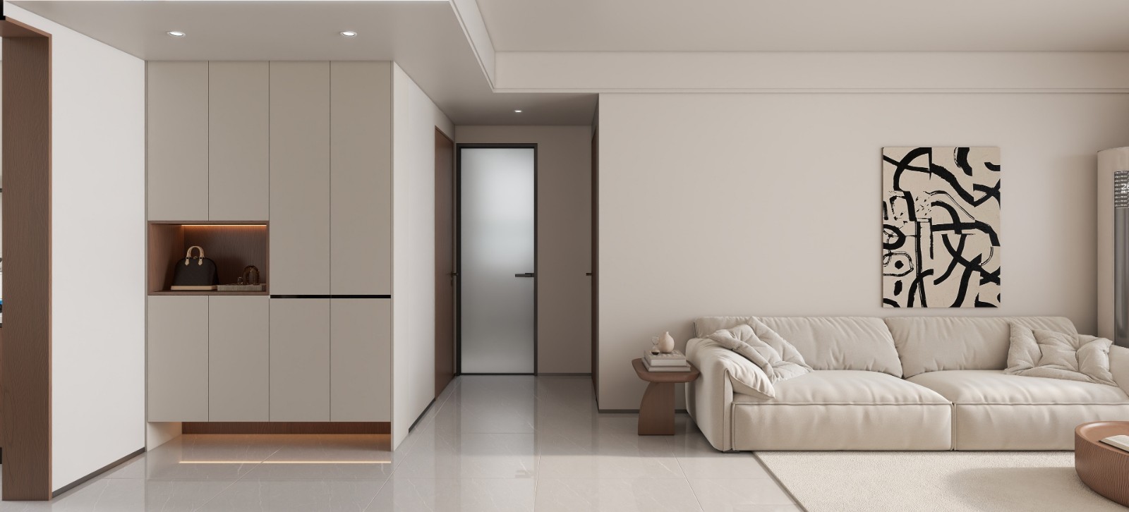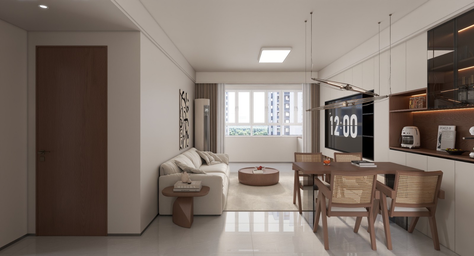 本案为两室一厅,原始格局比较合理,只是对厨房门洞稍加扩大,增加入户玄关的采光通透性。次卧采用高低床设计,门后整组的储物衣柜满足日常需求。客餐厅一体设计,餐边柜和电视柜合二为一,整体感更强。