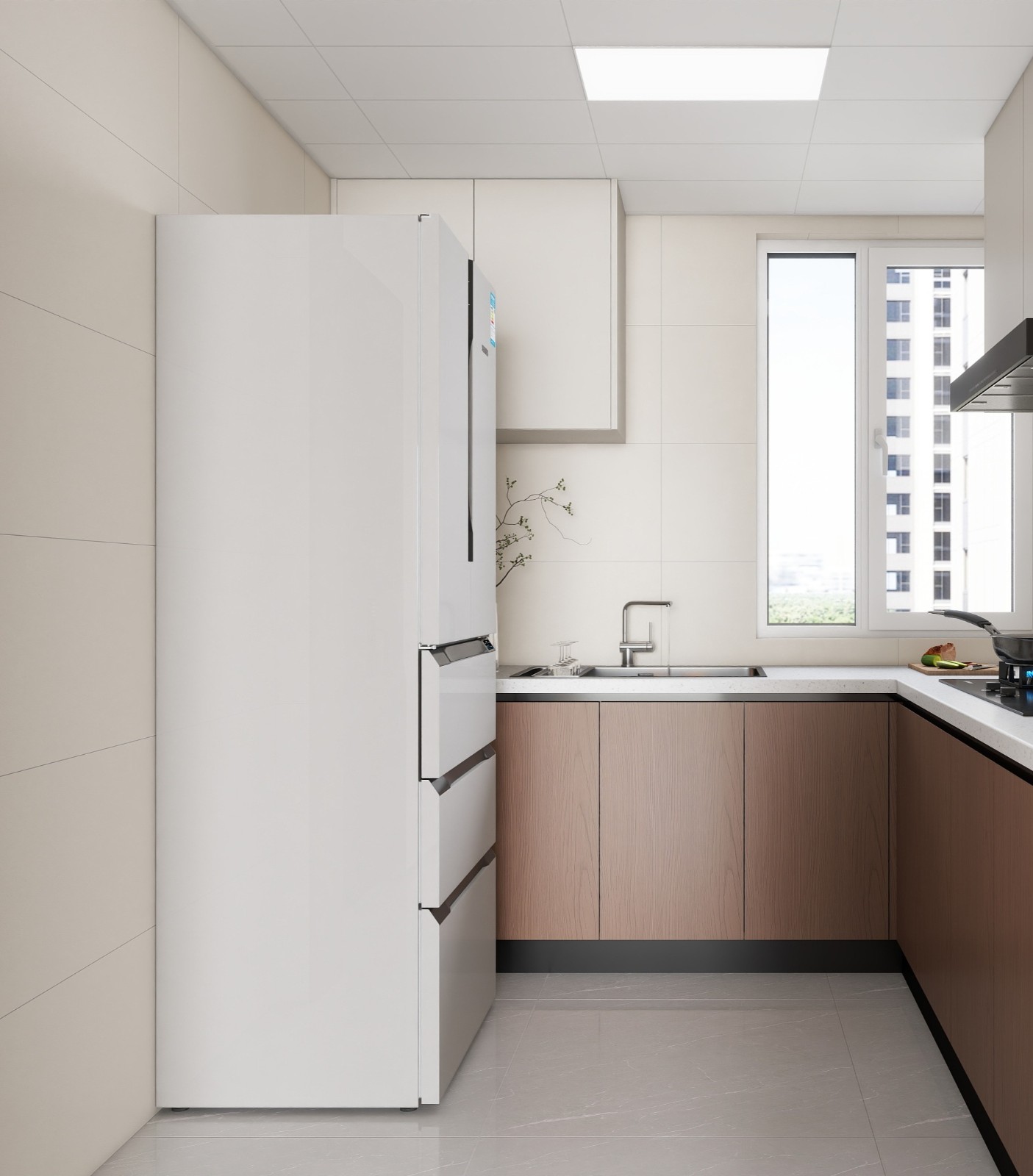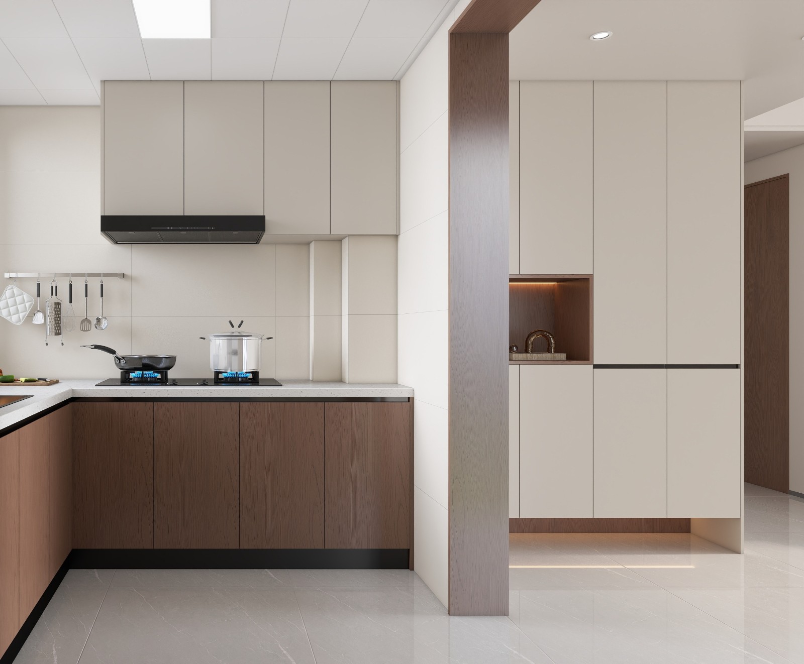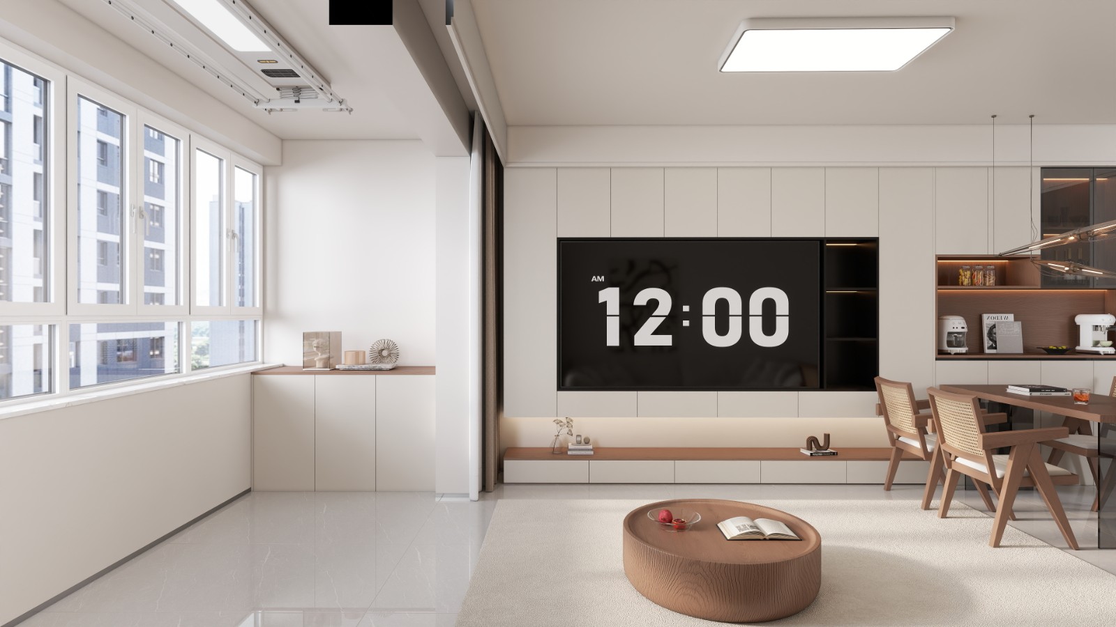本案为两室一厅,原始格局比较合理,只是对厨房门洞稍加扩大,增加入户玄关的采光通透性。次卧采用高低床设计,门后整组的储物衣柜满足日常需求。客餐厅一体设计,餐边柜和电视柜合二为一,整体感更强。